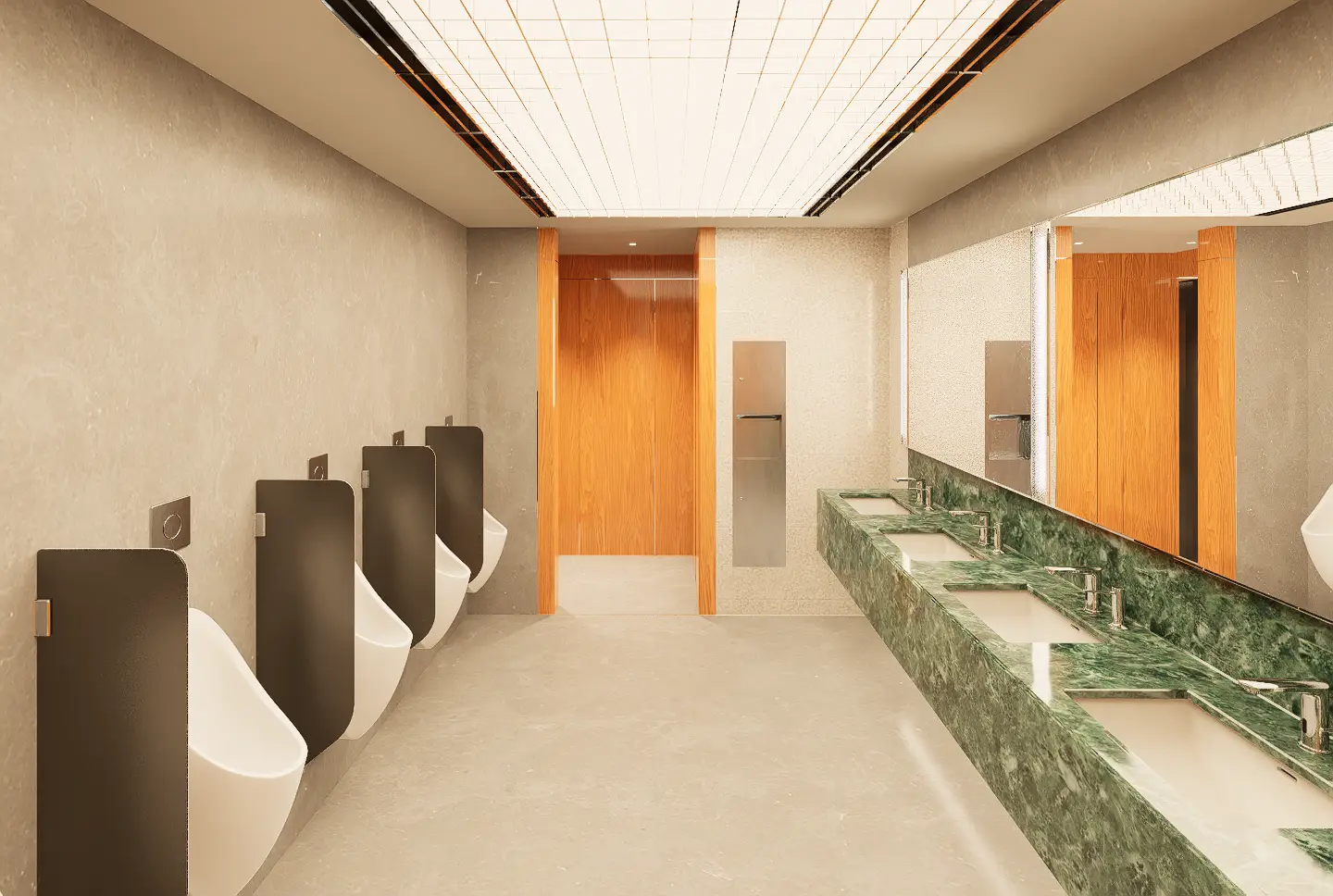 Fresh elements include the use of an acrylic grid ceiling below plane lighting, introducing a clean, diffuse glow, and patterned glass panels placed in front of tube lights around the mirror areas, adding visual depth and texture. Gender identity is subtly reinforced through green tones in the men’s rooms and red tones in the women’s, reflecting the original design cues. An ablution space is also provided, concealed behind a dark etched glass sliding door that opens with a wave sensor—ensuring privacy, ease of use, and a seamless integration into the overall design.
