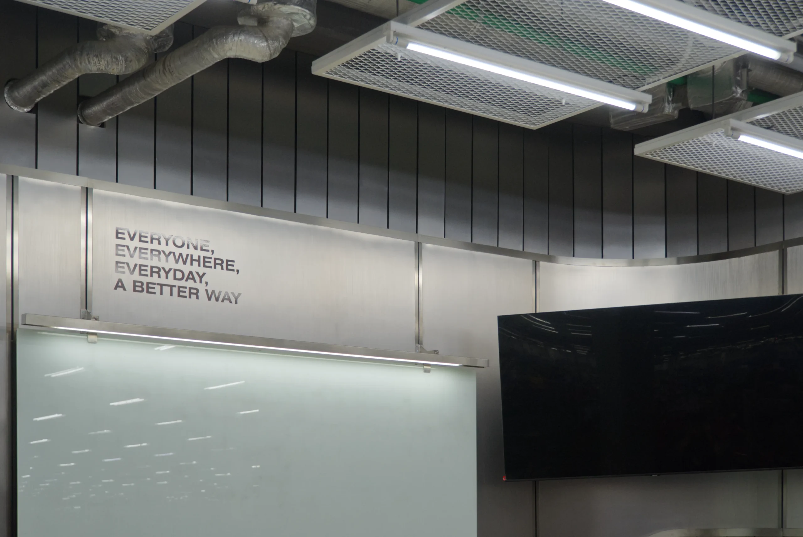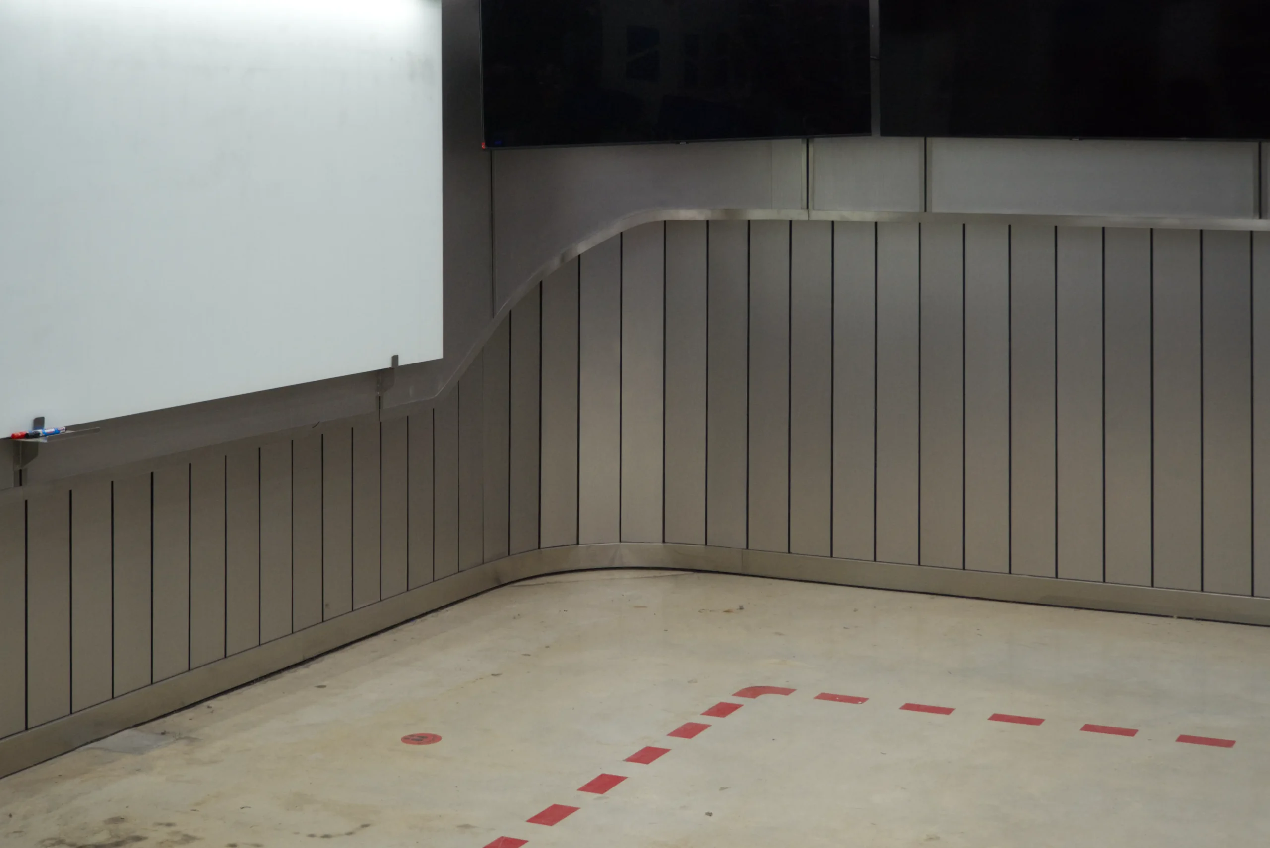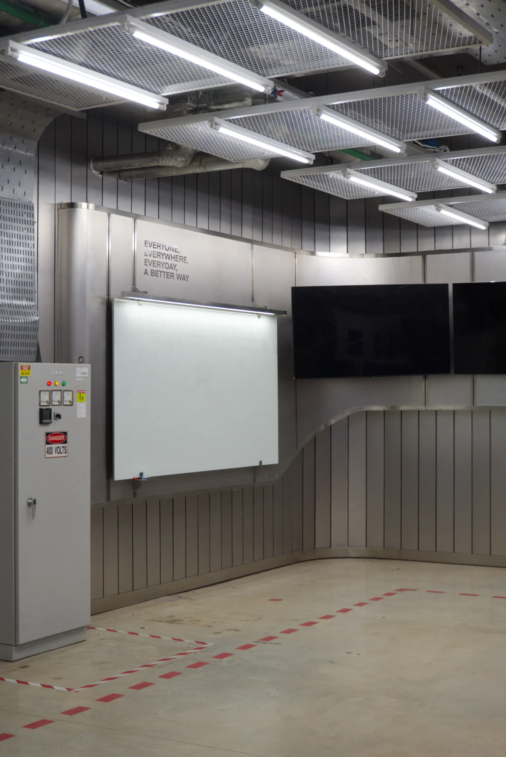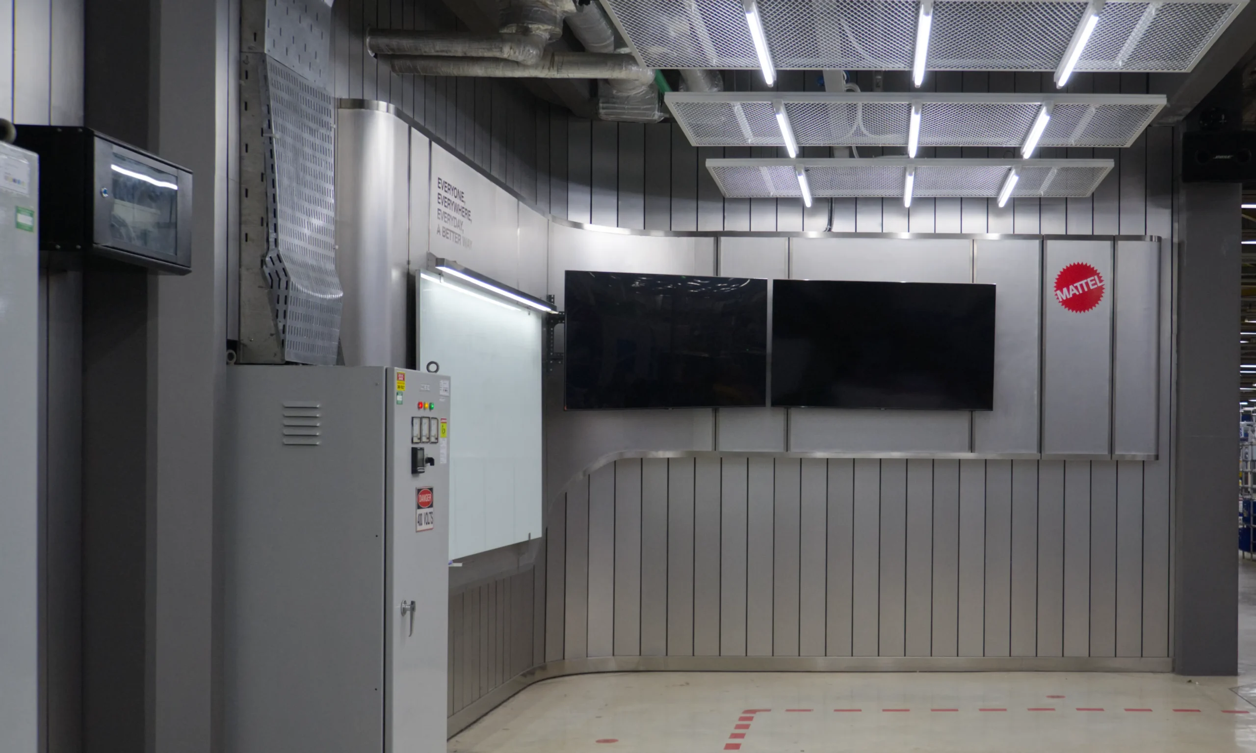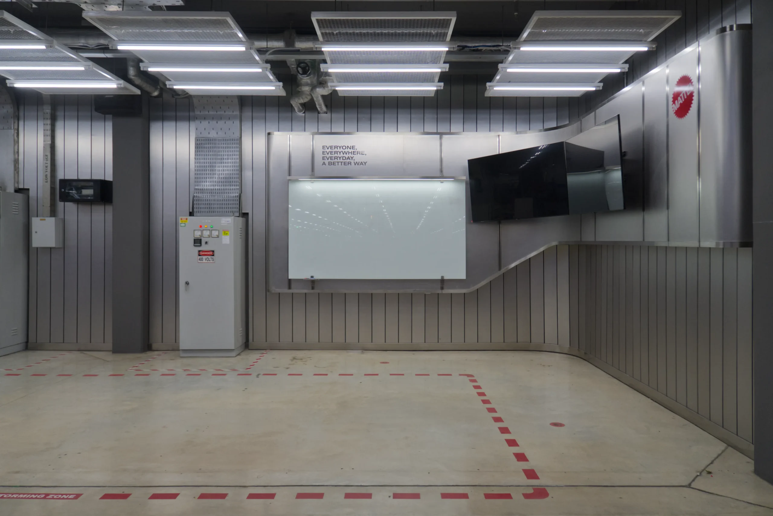 Aesthetically, the space is shaped by a palette of stainless steel finishes and grey metal sidings, carefully selected to echo the industrial context of the factory while introducing a futuristic sensibility. Unexpected curves in the otherwise rigid, rectilinear material language provide a sense of fluidity and sophistication, setting the space apart as a deliberate architectural intervention amid the production floor. The result is a functional yet striking area that supports collaboration, aligns with the factory’s identity, and subtly elevates the daily experience of its users.