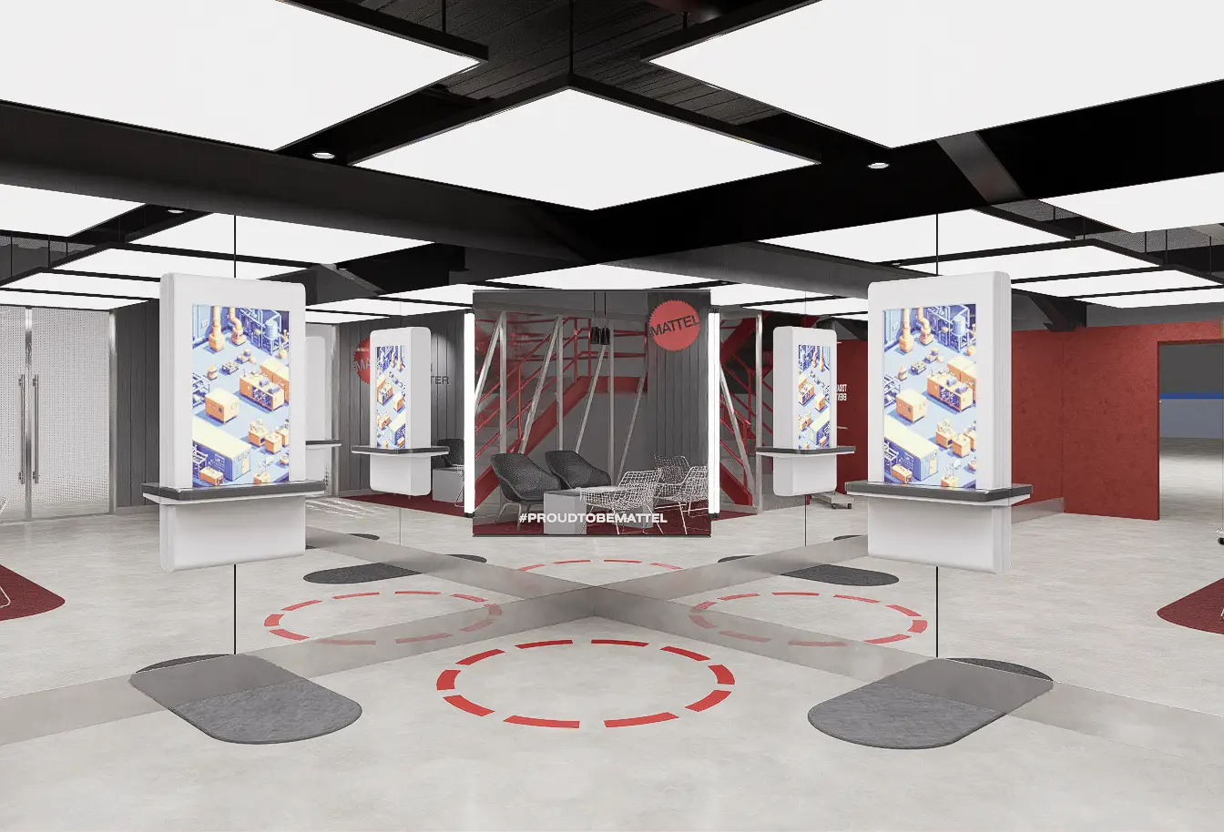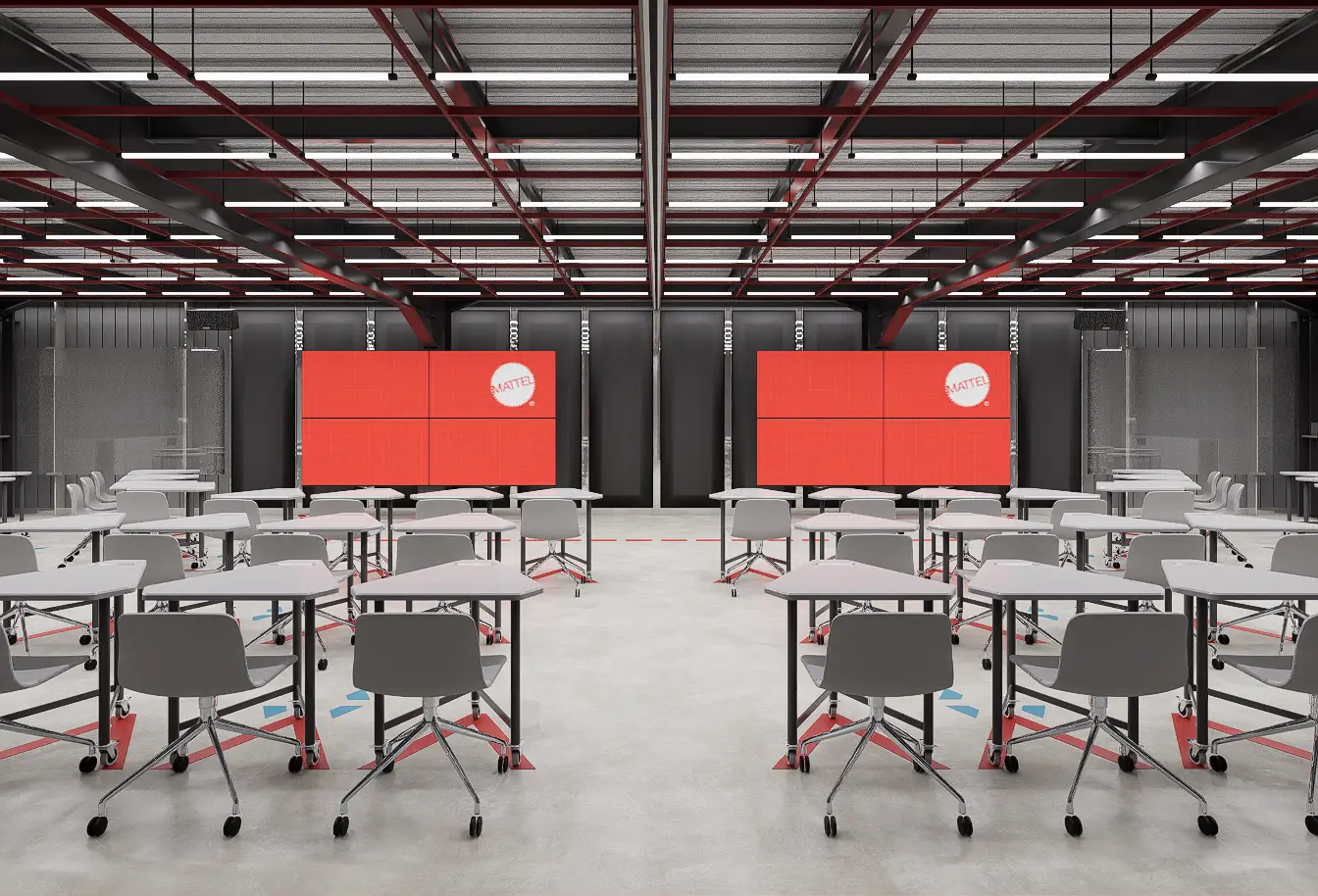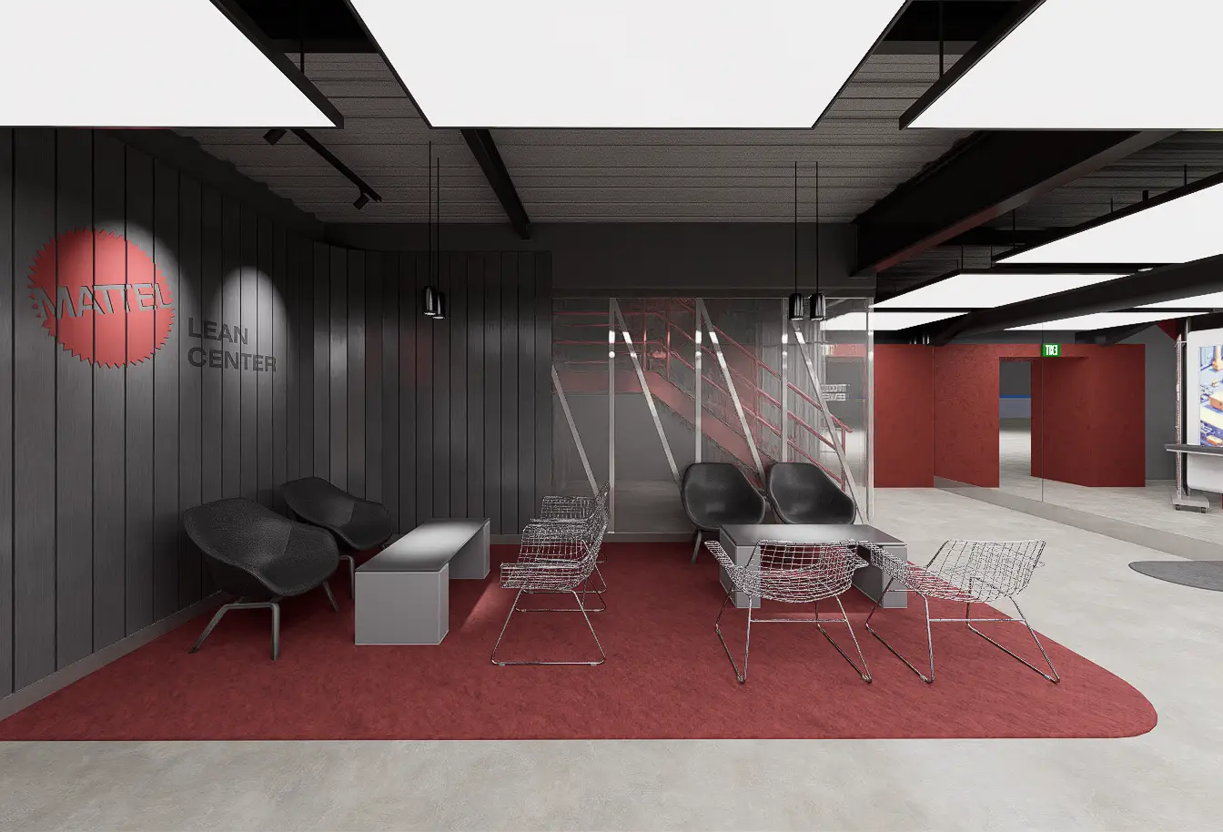 The Mattel Lean Center is a dedicated facility within the factory designed to support discussions, training sessions, and presentations centered around Lean methodology. At the entrance, a small rest area provides a space for factory workers to unwind, featuring seating and playful interactive elements that encourage casual socializing. This front zone also serves as a waiting area before users proceed into the main Lean Center space.