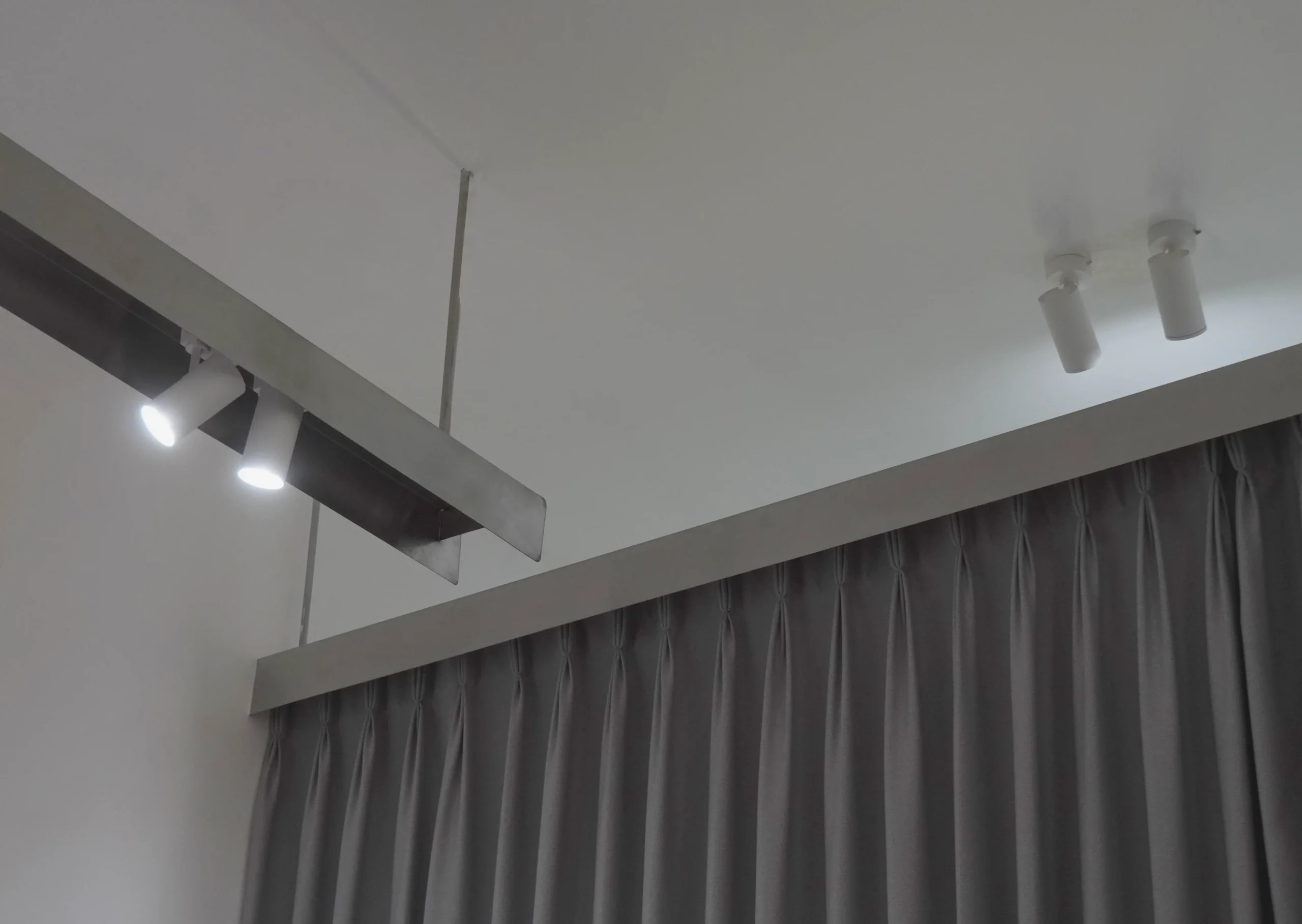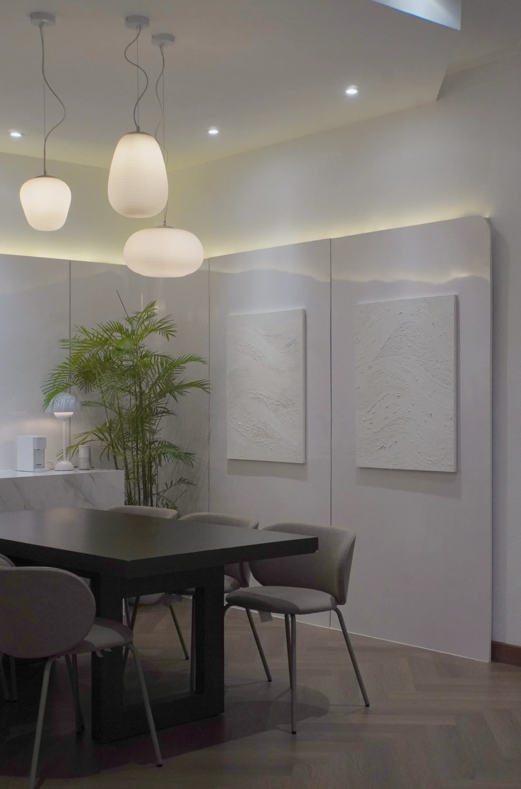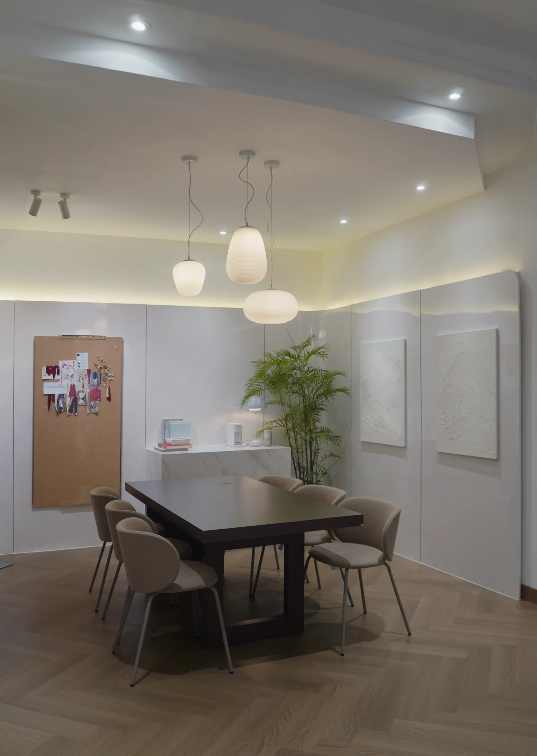 White was chosen as the primary color to evoke a bridal ambiance and allow the vivid tones of the cheongsams to take center stage. To keep the monochromatic scheme rich and layered, we used a variety of white finishes—smooth painted walls, textured surfaces, high-gloss panels in the meeting area, and white marble detailing on furniture. Flowing curtains are strategically placed to conceal doors, further distancing the space from its residential roots. A warm-toned wooden floor with subtly accentuated patterns anchors the showroom and adds contrast, helping define the different zones without rigid separations.